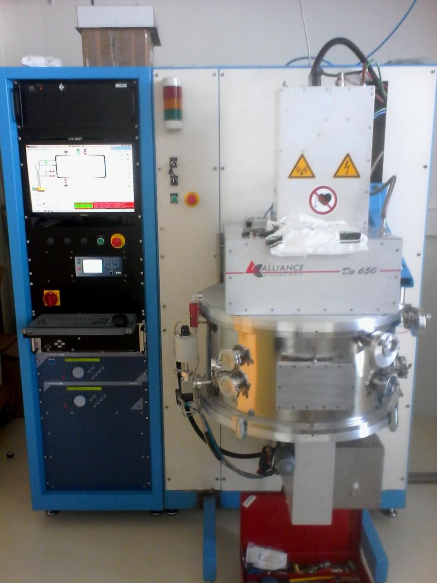 Contact: Attributes and Capabilities: Base Pressure is about 10-8 mbar Cryopumping system unit 40 x 13.5 cm2 target 5kW RF Huttinger generator Tilted substrated holder (+/- 15°) Biased with 600 W RF Huttinger generatir Ar, O2, N2 gases Compatible for AlN piezo films deposition Monitoring by Optical Emission Spectroscopy |