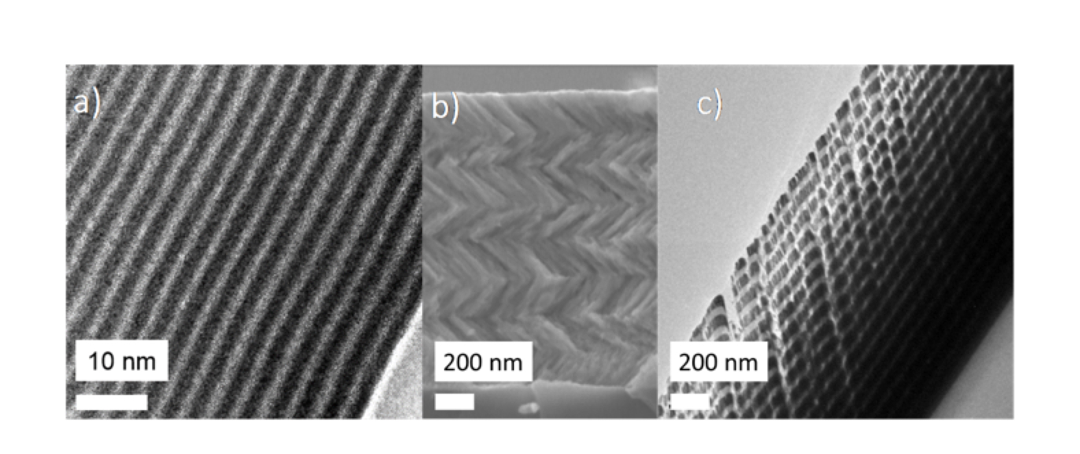 Fig. 1: a) multicouche périodique Ta/TaOx ; b) zigzags de WO3 ; c) W/WOx colonnaire par RGPP+GLAD.