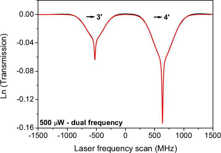 Figure 21: High-contrast sub-Doppler absorption spikes in a hot atomic vapor cell exposed to a dual-frequency laser field.
