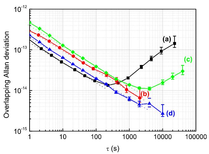 Figure 17: Allan deviation of the clock. (a) Ramsey-CPT, (b) First results obtained in the ABR-CPT regime, (c): SABR-CPT: extracted from a 5-days measurement, without compensation of the laser AM noise, (d): SABR-CPT, extracted from a 30 000 s data set with quiet experimental conditions, with additional compensation of the laser AM noise for improvement of the short-term stability. In the last case, the clock demonstrates a clock fractional frequency stability of 2 10-13 τ-1/2, until almost 104 s, reaching the level of 2.5 10-15 at 104 s.