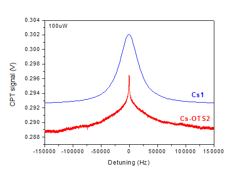 Figure 19: CPT resonance in a Cs-OTS cell (compared to a pure Cs cell of similar dimensions).