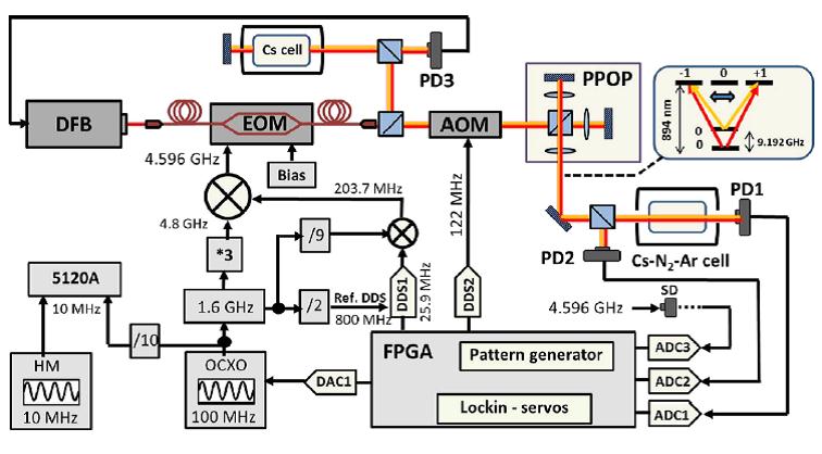Figure 12 shows the architecture of the Ramsey-CPT clock. It combines a DFB laser source tuned on the Cs D1 line, a fibered electro-optic modulator driven by a 4.596 GHz low noise microwave signal for generation of the CPT sidebands, an AOM for laser power stabilization and production of the Ramsey sequence and a Michelson delay-line and polarization orthogonalizer system for the generation of the PPOP scheme. The light is sent into a 5-cm long and 2-cm diameter buffer-gas filled Cs cell. The light at the output of the cell is detected by a photodiode. The output signal is exploited by a FPGA-based digital electronics board (developed by C. Calosso, INRIM) that generates the Ramsey sequence pattern and manages different servo loops. The local oscillator is an ultra-low phase noise 100 MHz OCXO frequency-multiplied to 4.596 GHz. The output signal of the 100 MHZ OCXO is at the end compared to a hydrogen maser for stability measurements.