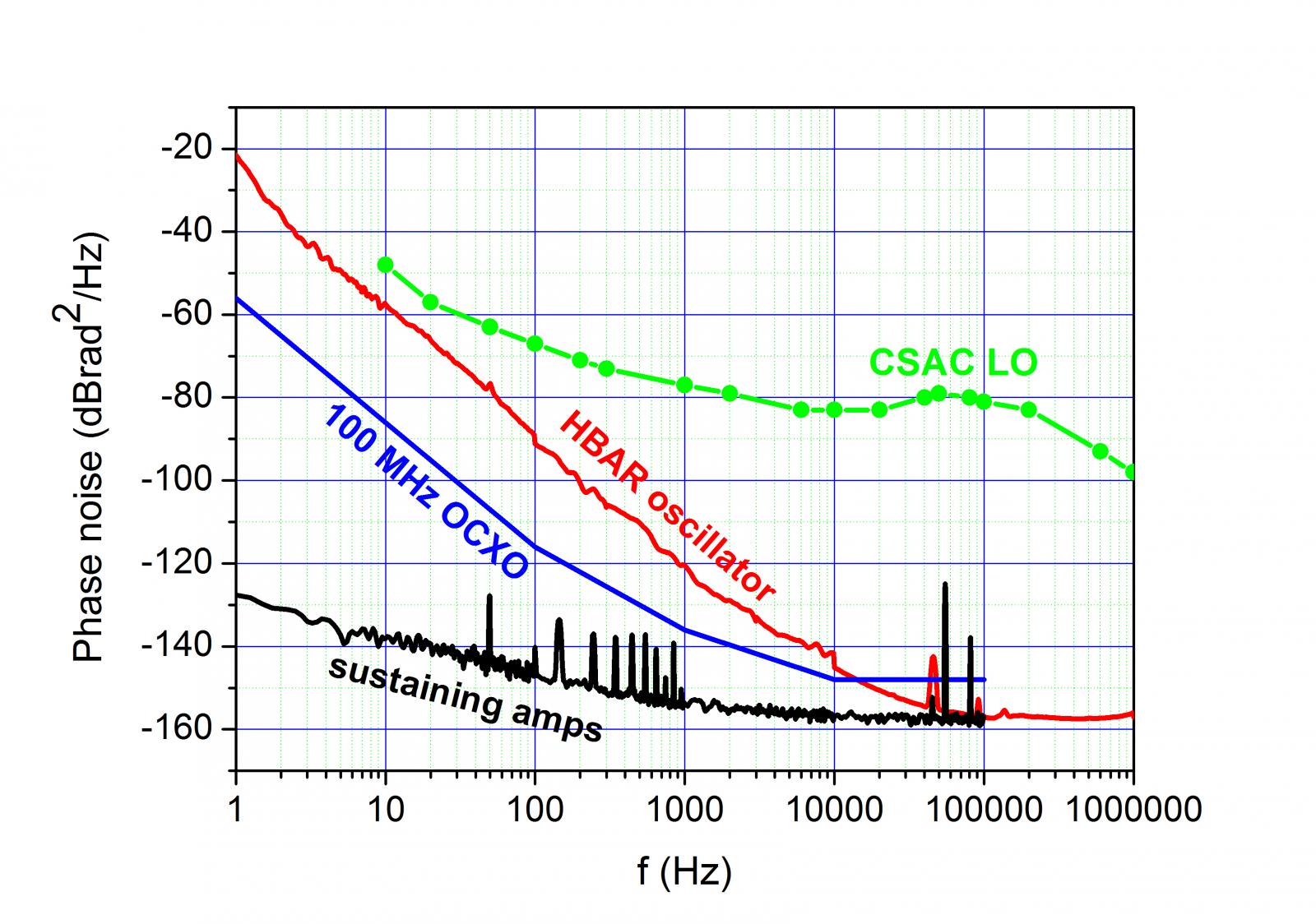 Figure 7: Phase noise performances of a 2.3 GHz HBAR oscillator (in red). Performances compared to those of a conventional MAC LO or to state-of-the-art ideally frequency-multiplied 100 MHz OCXO.