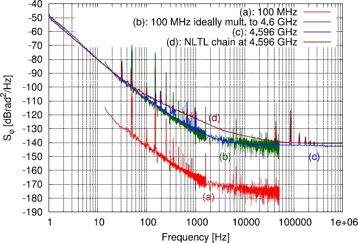 Figure 15: Absolute phase noise performances of the microwave frequency synthesizer shown above. The pilot is a low noise 100 MHz OCXO (perfs in red at 100 MHz). The green data shows the absolute phase noise at 4.596 GHz. The green line is the phase noise at 4.596 GHz of the ideally frequency-multiplied 100 MHz OCXO.