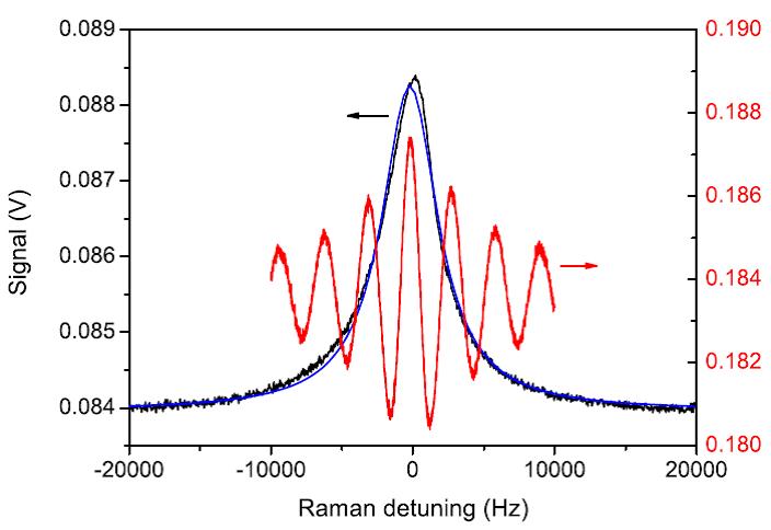 Figure 11: Typical CPT resonance detected in the CW regime (black) and in the pulsed Ramsey-CPT regime (red), in a Cs-Ne MEMS cell.