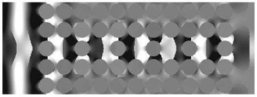 Fig. 5 – Cristal phononique constitué de trous dans une plaque de silicium. Les trous ont un diamètre de 6 microns et sont profonds de 100 microns. Un tel cristal phononique présente une bande interdite complète autour de 500 MHz.