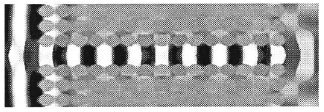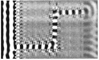 Des guides d'onde très efficaces peuvent être ménagés dans un cristal phononique. Par exemple, la figure 7 montre une simulation numérique de la propagation des ondes acoustiques le long d'un guide d'onde droit ménagé en ôtant une ligne complète de périodes d'un cristal phononique. Pour toutes les fréquences dans une bande interdite complète, les ondes incidentes à l'entrée du guide n'ont d'autre choix que de suivre la direction des défauts, car toute autre direction est interdite dans le cristal phononique. Dans l'exemple de la seconde image, un guide d'onde a été ménagé en ne retirant d'une inclusion sur deux le long d'une ligne. Dans ce cas, la progression des ondes se fait par couplage successif de défaut à défaut et fait intervenir des ondes évanescentes, c'est-à-dire des ondes qui n'existent que dans le voisinage immédiat de la source qui leur donne naissance et lui restent attachées. Il est loisible de définir un chemin relativement arbitraire, pourvu que les différentes branches restent toujours séparées par une épaisseur suffisante de cristal phononique. Il est en particulier possible de réaliser des guides d'onde fortement coudés, comme l'illustré la troisième image.