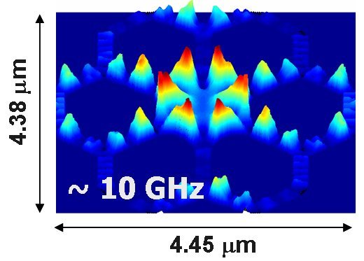 Nous pensons pour notre part que c'est à l'échelle microscopique que les cristaux phononiques ont le plus de potentiel. Pour des périodicités de quelques microns ou moins, les bandes interdites apparaissent pour des fréquences de quelques centaines de MHz ou de quelques GHz, en plein dans le domaine des communications sans fil (Fig. 5). De nouveaux composants mariant microélectronique et ondes acoustiques pourraient voir le jour et étendre les capacités des téléphones portables et des réseaux sans fil, par exemple. Un point essentiel est que les principes des cristaux phononiques s'expriment de la même façon quelle que soit l'échelle choisie pour leur réalisation, seules les fréquences de fonctionnement changent. Cette propriété fondamentale a deux conséquences importantes. La première est que les concepts des cristaux phononiques peuvent être démontrés à l'échelle, c'est-à-dire avec des structures dont les dimensions sont relativement grandes, donc facilement accessibles. La seconde conséquence est qu'avec le développement des micro et des nanotechnologies, des cristaux phononiques de plus en plus petits peuvent être réalisés par des procédés qui ressemblent à ceux de la microélectronique, employés par exemple pour la réalisation des microprocesseurs de nos ordinateurs. La microélectronique a débuté il y a cinquante ans, la photonique suit depuis une vingtaine d'année et arrive à maturité ; l'avenir dira si la nanophononique pourra suivre ces exemples prestigieux.