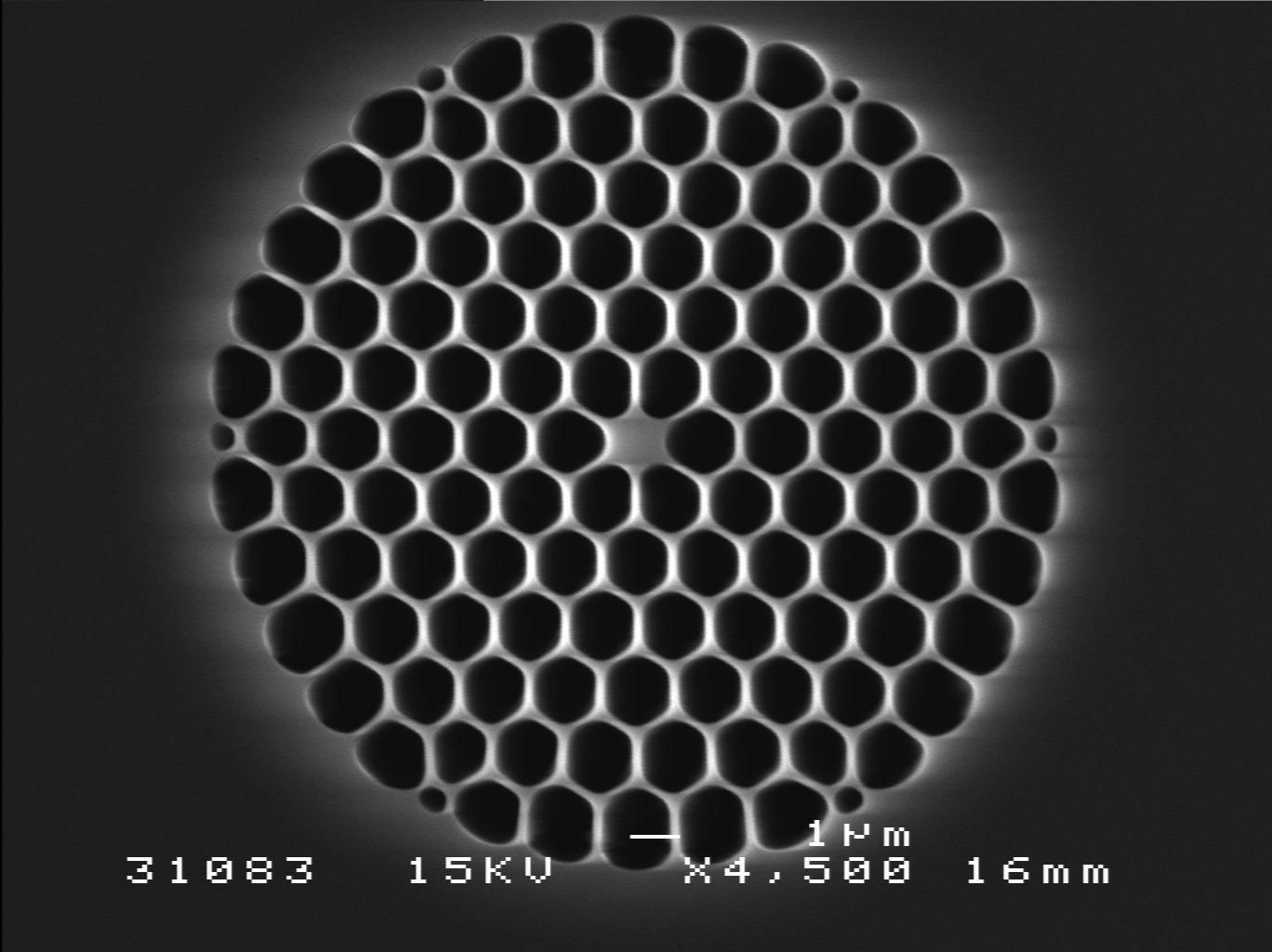 Une fibre photonique est une fibre optique percée de trous de taille micrométrique qui courent le long de l'axe de la fibre sur des centaines de mètres, voire des kilomètres. L'exemple de la figure 8 montre la section d'une telle fibre en silice fabriquée à l'Université de Bath en Angleterre et observée au microscope électronique à balayage. Le coeur central de cette fibre optique est l'équivalent d'un barreau de verre d'un diamètre de 1,2 microns, soit le centième du diamètre d'un cheveu. Il a pour fonction de transporter l'énergie lumineuse sur de très longues distances. Comme nous l'avons montré récemment, une telle fibre photonique est également un excellent piège à phonons. L'image ci-contre représente l'énergie d'un phonon acoustique guidé par un effet de bande interdite phononique le long du coeur de la fibre. Un tel phonon est impliqué dans l'effet Brillouin stimulé, un effet acousto-optique non linéaire qui limite la puissance lumineuse qui peut être transportée le long d'une fibre optique et qui a donc un fort impact économique dans le domaine des télécommunications.